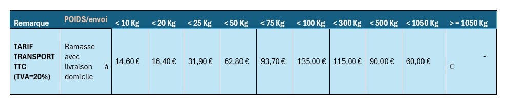 Les produits peuvent être acquis sans frais de transport, dans ce cas l’acheteur doit venir retirer sa commande en click and collect à l’entrepôt de Saint-Paul-de-Varax (FR-01240) dans les conditions qui lui auront été précisées. Pour les articles vendus avec livraison incluse, les prix selon les quantités et lieu géographique sont précisés et présentés dans le site lors de la commande et notamment par les Conditions Générales de Livraison.